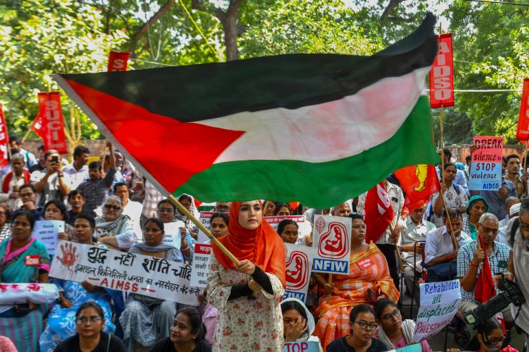 Carrying a placard that read “Stop the massacre”, Sharma, 52, said she condemned India’s support of Israel, including weapons sales. “Why are we sending arms to Israel?” she asked. “Why are we supporting Israel in any way?”