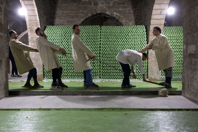 Making Aleppo soap is a lengthy process. After the mixture is prepared, it is left to cure for six to eight months, allowing it to oxidise and change colour from dark green to yellow.
