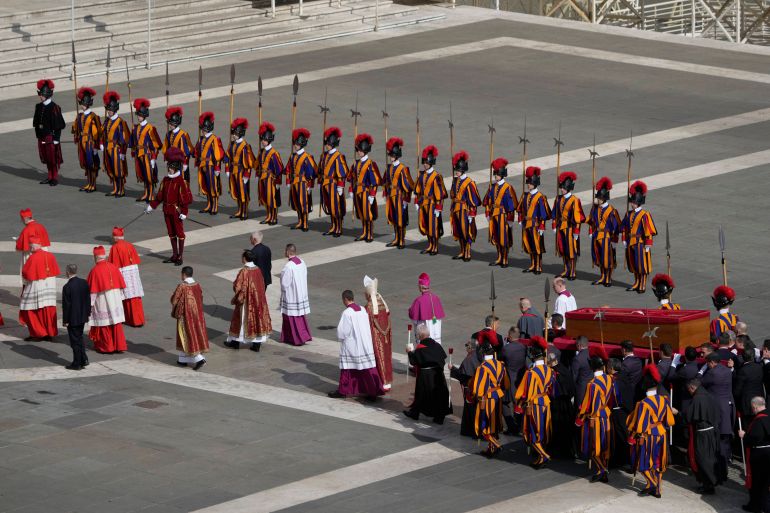 Pope Francis’s open coffin has been carried to Saint Peter’s Basilica, accompanied by dozens of red-robed cardinals and Swiss guardsmen.
