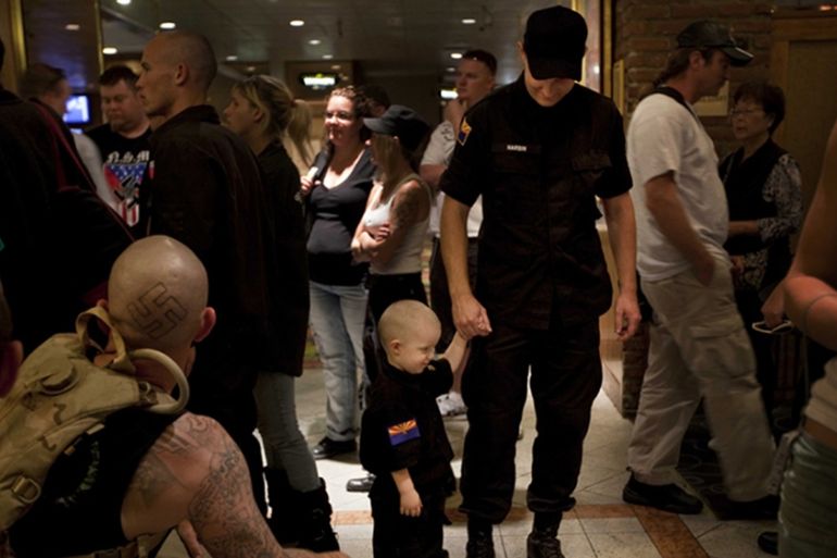 ![National Socialist Movement members try to protect themselves from rocks and glass being thrown by counter-protesters as they leave their rally on the steps of Los Angeles, City Hall. April 2010 [Julie Platner]](https://www.aljazeera.com/wp-content/uploads/2015/06/3f491b2dc510487e9f962e96cac31a16_18.jpeg?quality=80)