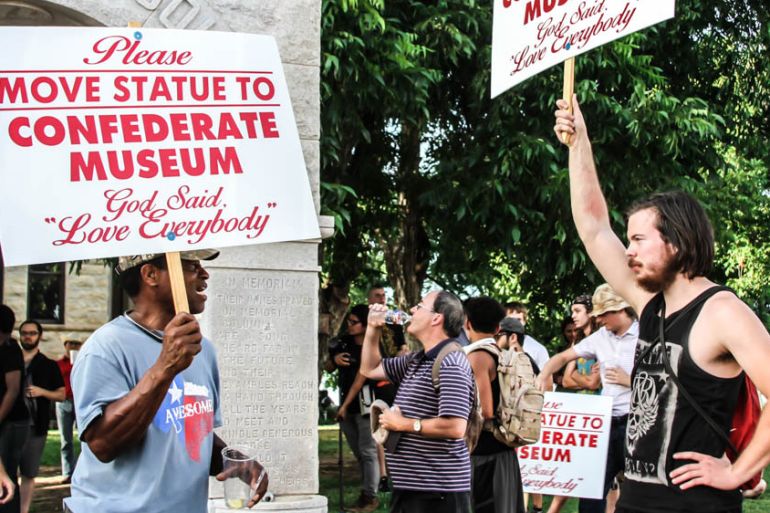 ![Local activists gathered in front of the Denton Municipal Court House to protest the Confederate Soldier Monument and demand its transfer to a museum [Shaghayegh Tajvidi/Global News Insight]](https://www.aljazeera.com/wp-content/uploads/2015/07/dee641f6fcb648bdafefcf4ed5df0b7f_18.jpeg?quality=80)