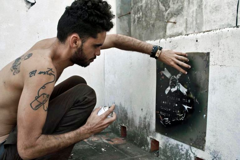 Now jailed artist Danilo Machado, AKA 'El Sexto', sprays graffiti on a wall in Havana [Berenice Aguirre/Global News Insight]