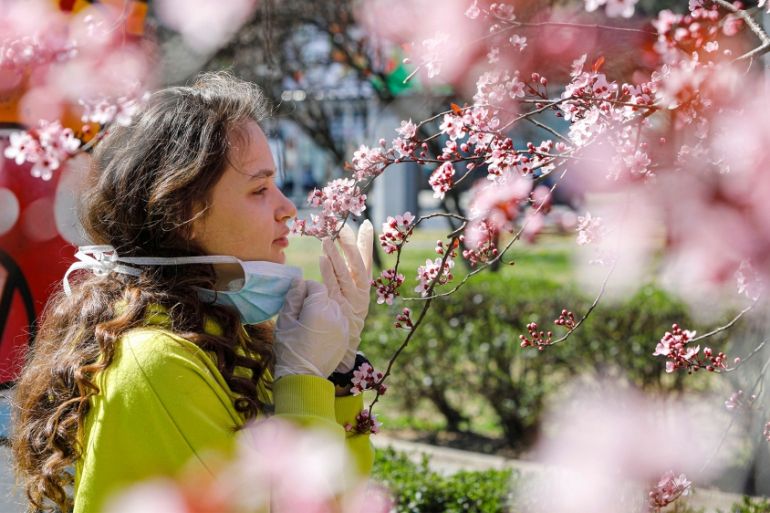 A girl removes her mask to smell the flowers in Skopje, North Macedonia on March 20, 2020 [Ognen Teofilovski/Reuters]