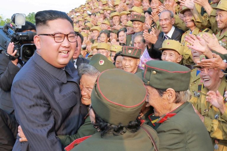 Kim meets participants of the fifth National Conference of War Veterans in this undated photo released by North Korea's Korean Central News Agency in July 2018 [KCNA via Reuters]
