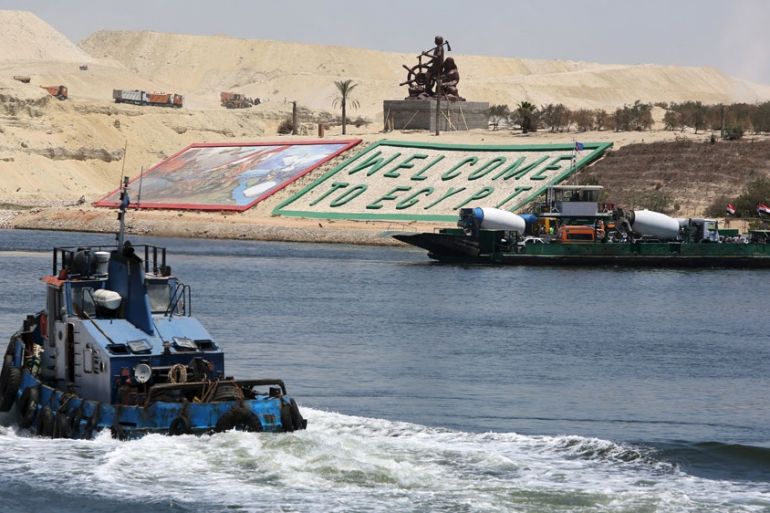 On Wednesday, the front page of the semi-official al-Akhbar newspaper carried an image of the Egyptian President Abdel-Fattah el-Sisi at the helm of a ship steering it through the canal, with smiling citizens waving flags enthusiastically in the background.