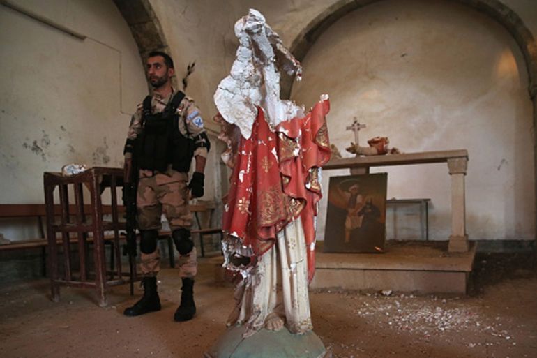 ![A Christian militiaman stands near the broken body of a statue of Christ in the 13th century St. Jacob''s Church near the frontline with ISIL fighters in Telskuf, northern Iraq [Getty]](https://www.aljazeera.com/wp-content/uploads/2016/04/bb8dbefc21a941939773c392773da577_18.jpeg?resize=770%2C513&quality=80)