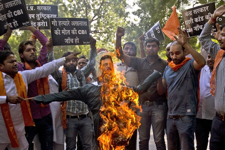 Activists of Hindu Sena protest against a government inquiry's conclusion that Mohammed Akhlaq, victim of mob lynching in Uttar Pradesh, was not storing beef for consumption [AP/Saurabh Das]