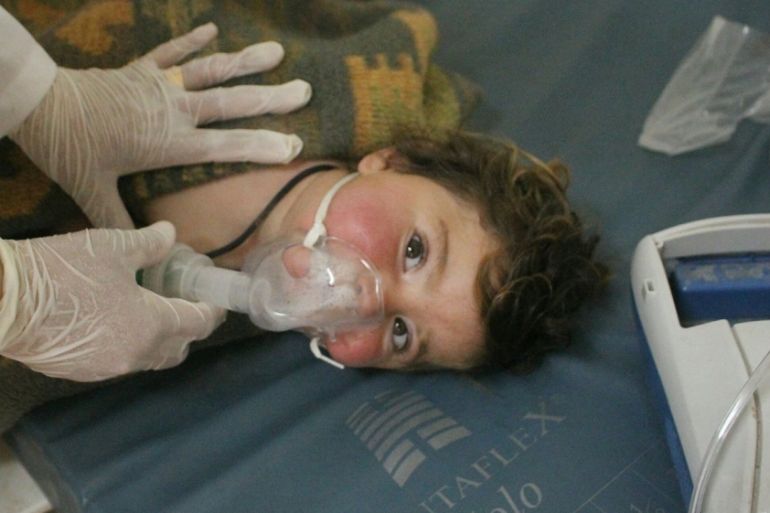 A child receiving treatment at a field hospital after the April 4 chemical attack in the Syrian town of Khan Sheikhoun [EPA]
