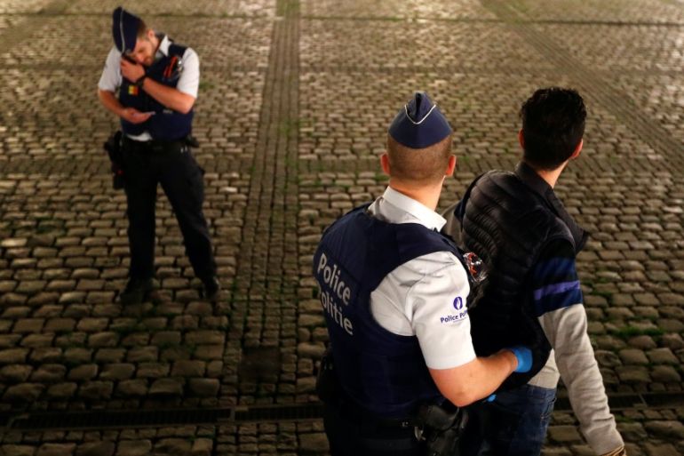 Police officers on patrol search a man, during the lockdown imposed by the Belgian government to slow down the spread of Covid-19, in Brussels, Belgium on April 17, 2020 [Francois Lenoir/Reuters]