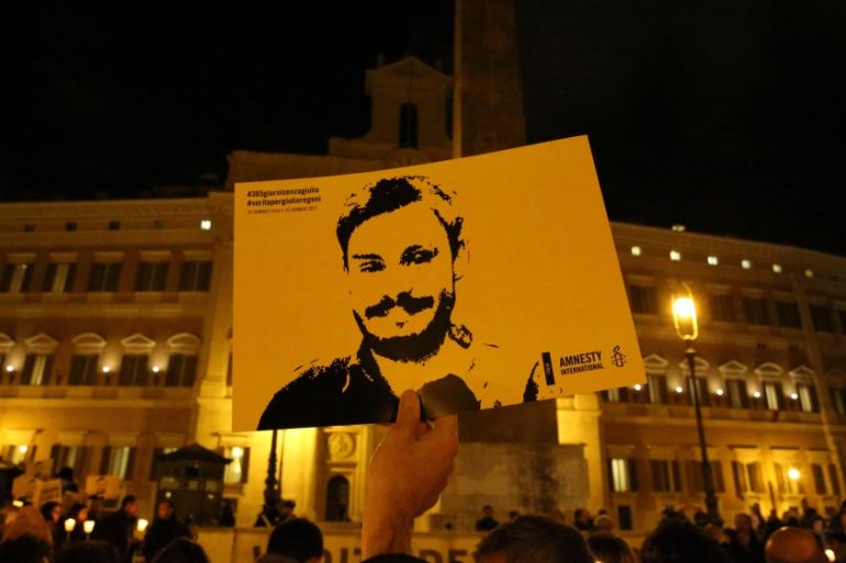 Egyptian authorities initially claimed Regeni had been hit by a car, but then changed their story several times. Italian investigators uncovered signs of systematic torture on Regeni’s body; he had been brutally beaten, electrocuted, and burned.