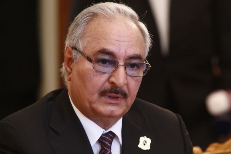 ![General Khalifa Haftar attends a military ceremony with Egyptian President Abdel Fattah al-Sisi, right, and Abu Dhabi Crown Prince Mohammed bin Zayed, centre, at the Mohamed Najib military base in Marsa Matrouh, Egypt on July 22, 2017 [File photo: Reuters]](https://www.aljazeera.com/wp-content/uploads/2018/04/fcc258e3b66c4b24a9e6ef46c73f5e16_18.jpeg?quality=80)