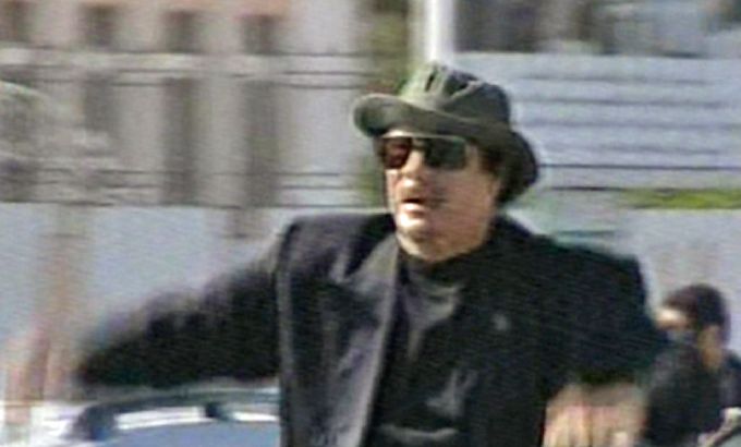 State television also showed footage of a defiant Gaddafi cruising through the streets in a green safari jacket and sunglasses, pumping his fists and waving from an open-top vehicle.