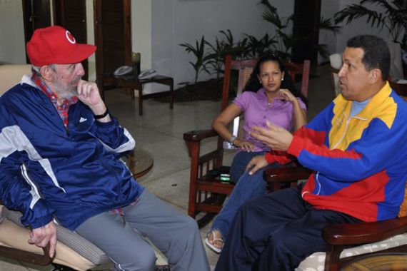 | Fidel Castro and Hugo Chavez read a copy of the Cuban Communist Party newspaper in Havana on June 28 [REUTERS] |