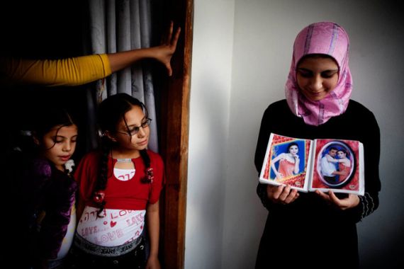 | 2) In the Gaza City home of Dr Jamal Shareef, a literature professor at Al Azhar University, his 16-year-old niece (R) shows pictures of her fiancé [Tanya Habjouqa] |