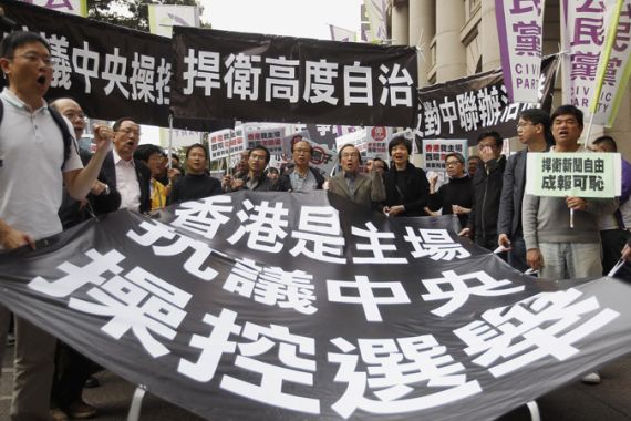 Hundreds of pro-democracy activists packed the streets around the harbourside convention centre where the committee meeting was taking place, shouting slogans demanding “direct elections”.