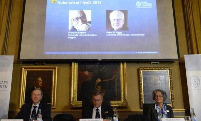 British and Belgian scientists receive prize for predicting the existence of the Higgs boson, or “God particle”.