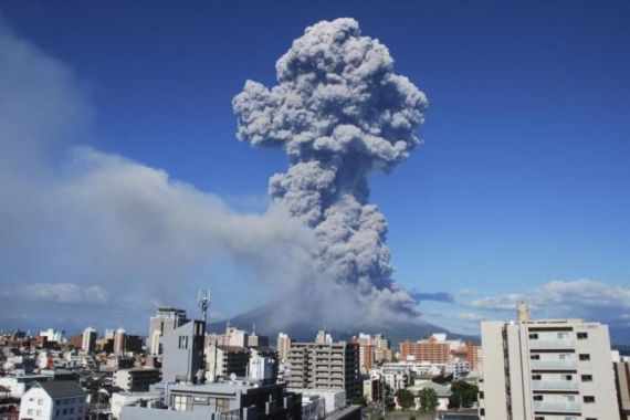 Ash from Sakurajima in country’s southwest coats nearby Kagoshima city and forms plume 5,000 meters high.