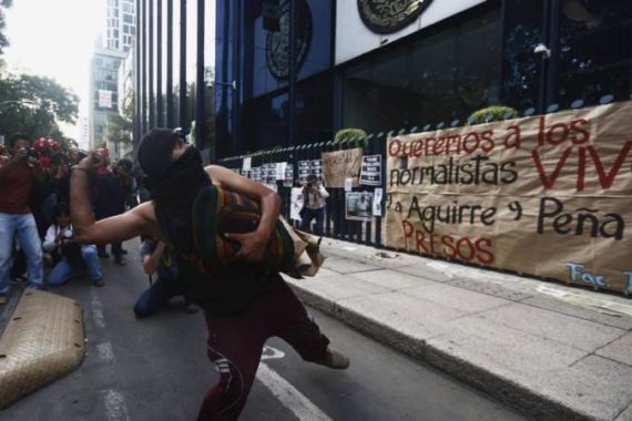 Protests over 43 missing students turned violent when angry students started pelting stones and smashing windows of the attorney general’s office in Mexico City.