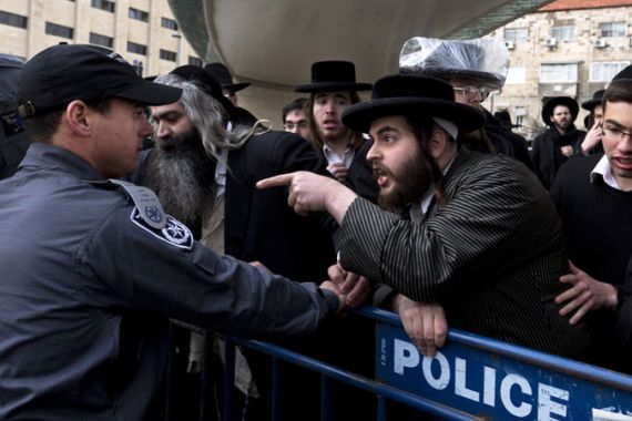 Thousands of ultra-Orthodox Jews have blocked highways across Israel to protest attempts to draft them into the army, clashing with police who fired stun grenades at large crowds of black-garbed men.