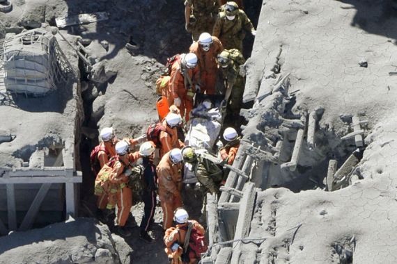 About 550 soldiers, police officers and firefighters were involved in a large-scale search-and-rescue operation in a bid to save dozens of hikers who were thought to have been stranded on the volcano since it erupted without warning spewing ash, rocks and steam into a sunny autumn weekend busy with tourists and hikers.