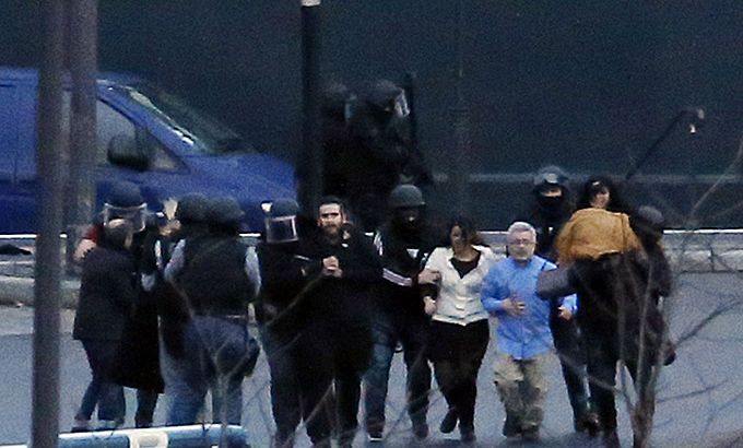 Around 5:15pm (1615 GMT) security forces are seen storming the supermarket in Porte de Vincennes in eastern Paris. Five people are found dead, including the gunman, and four people are critically wounded, according to a security source.