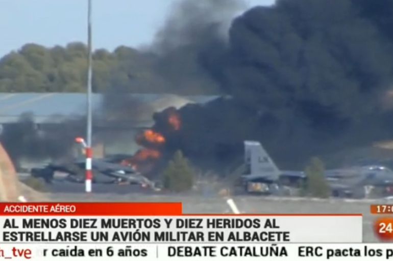 National television footage showed flaming wreckage and a plume of black smoke where the plane crashed at the Los Llanos base.