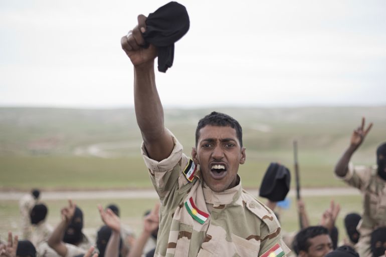 Bashiqa, Iraq – A 33-year-old man, once a sergeant in the Iraqi army, turns his head to hide the tears flowing down his face. His fellow soldiers are singing and chanting as they march across green fields just 21km away from Mosul, which is controlled by the Islamic State of Iraq and the Levant (ISIL).