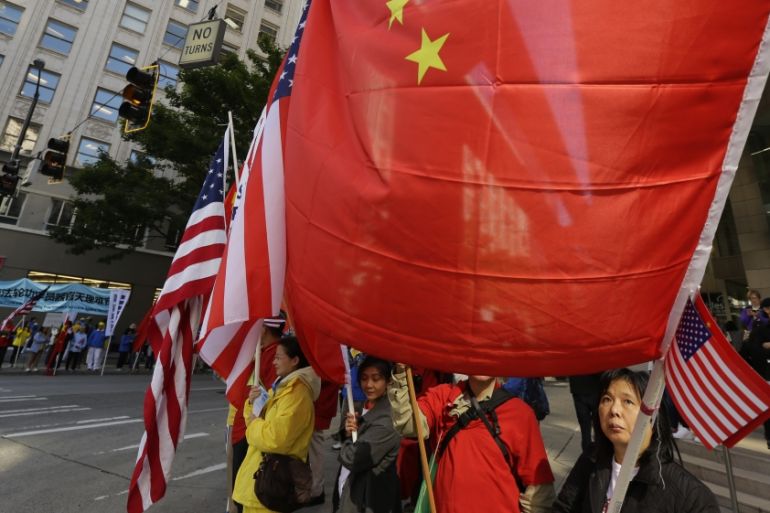 At the same time, a group of pro-Chinese protesters, some of them wearing hats emblazoned with “USA” waved Chinese and US flags and large red cloth signs that read: “Hello President Xi” in Chinese characters.