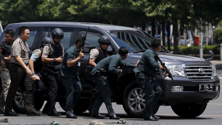 ![Police gathered outside a restaurant near the scene of an attack in central Jakarta [Beawiharta/Reuters]](https://www.aljazeera.com/wp-content/uploads/2016/01/ba50574b2f744b8e9f926a8dd0055e76_18.jpeg?quality=80)