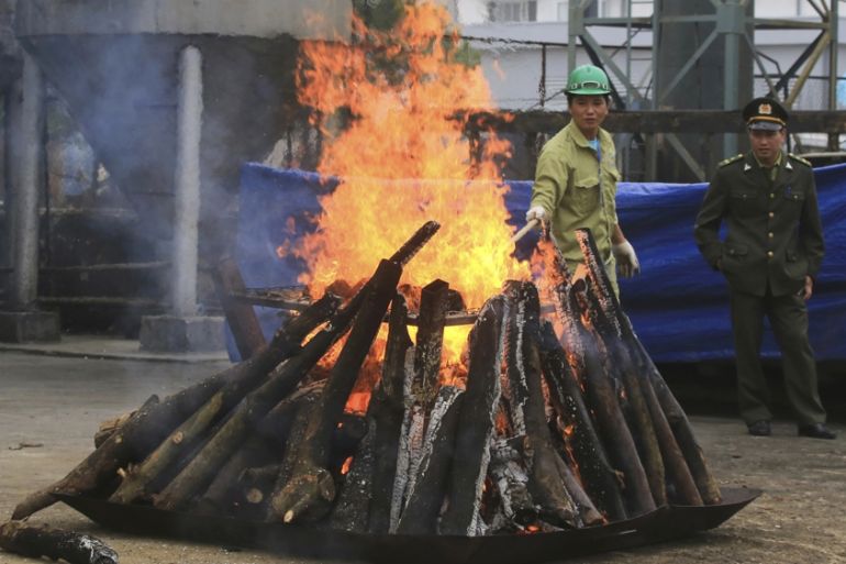 Saturday’s burning came before a major international wildlife conference in Hanoi opening on Thursday that will be attended by Britain’s Prince William, who has championed animal conservation.