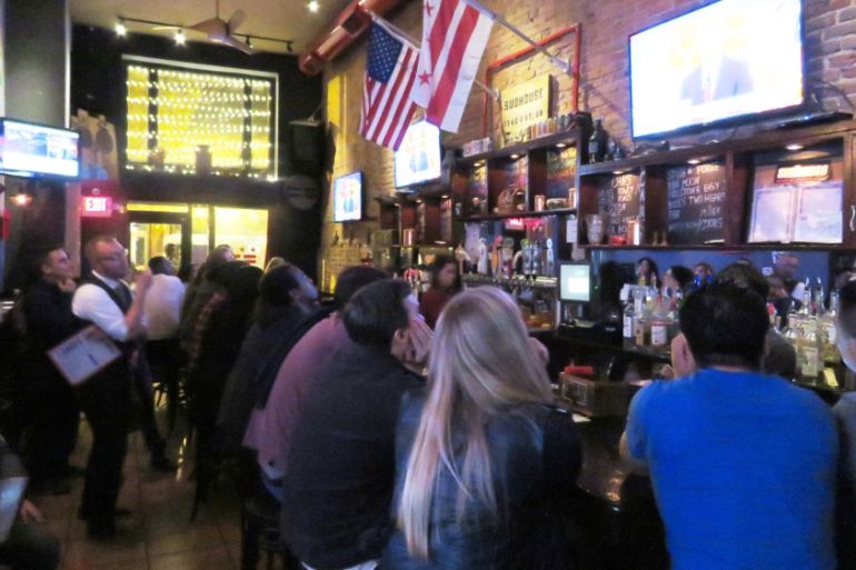 Washington DC, US – In a college bar in the centre of town, students from the DC College Democrats gathered en masse to watch the US election results come in over beer and burgers.
