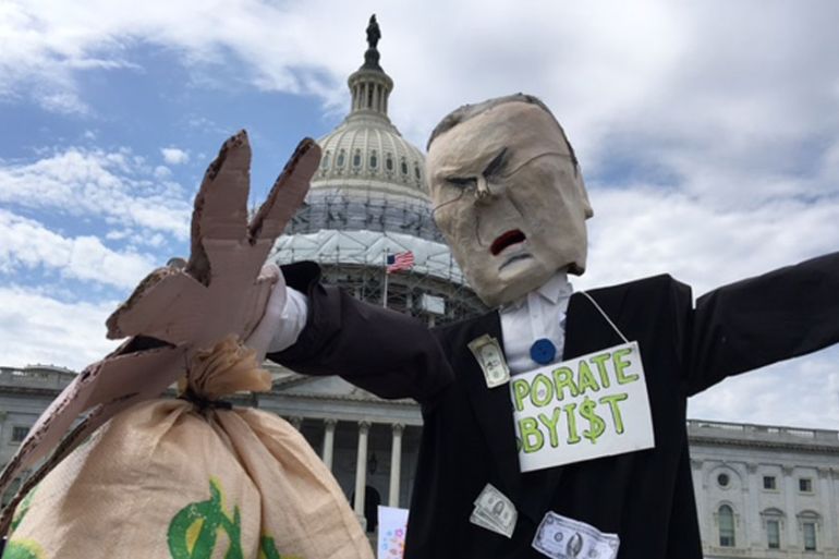 Police arrest dozens as about 500 people hold sit-in outside US Congress to highlight corporate influence in politics.