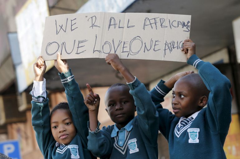 Schoolchildren hold a placard during a march against xenophobia in downtown Johannesburg in April 2015 [Mike Hutchings/Reuters]