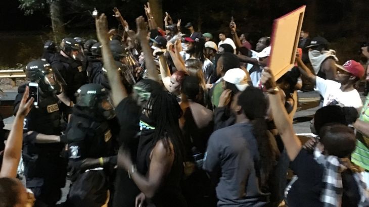 Video from WCCB-TV in Charlotte showed police in riot gear stretched across a two-lane road confronting protesters at the apartment complex later in the night.