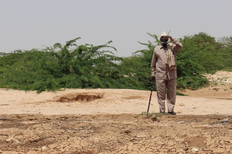 To Abdullahi’s left, imposing cliffs of dirt stretch several metres up, small trees and cacti clinging onto the edge – just another rainy night away from succumbing to erosion and joining Abdullahi on the valley floor.