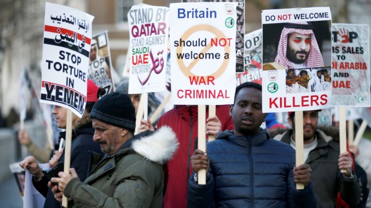 London, England – Mohammad bin Salman is starting his visit to the UK on Wednesday, with the ruling Conservative Party and royal family rolling out the red carpet for Saudi Arabia’s crown prince as opposition politicians and rights groups call on British Prime Minister Theresa May to use the trip to challenge the kingdom’s record on human rights.