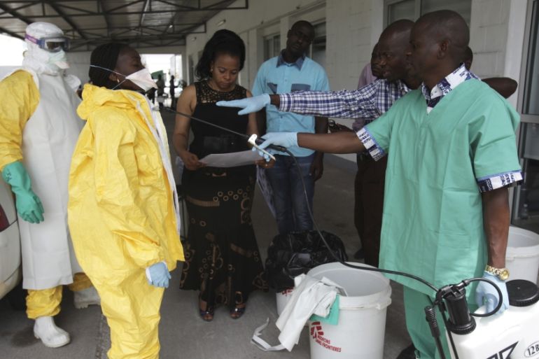 ![A health worker sprays a colleague with disinfectant during a training session for Congolese health workers to deal with Ebola virus in Kinshasa October 21, 2014. [File: Coulibaly/Reuters]](https://www.aljazeera.com/wp-content/uploads/2018/05/9b66bb76e97b4b9c988140f1c73cde02_18.jpeg?resize=770%2C513&quality=80)