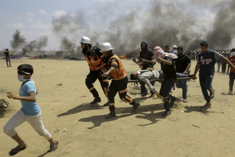 ![Palestinian medics and protesters evacuate a wounded youth during a protest at the Gaza Strip''s border with Israel, east of Khan Younis. [Adel Hana/AP Photo]](https://www.aljazeera.com/wp-content/uploads/2018/05/dd494b5127df48c38604f2f0162d5606_18.jpeg?resize=770%2C513&quality=80)