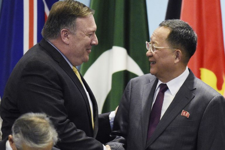 On Saturday, Pompeo briefly met North Korea’s foreign minister, greeting him at a joint photo of ministers, with the pair shaking hands, smiling and exchanging some words.