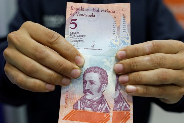 ![Venezuela's President Nicolas Maduro holds a bank note from the new Venezuelan currency Bolivar Soberano (Sovereign Bolivar) [Miraflores Palace handout/Reuters]](https://www.aljazeera.com/wp-content/uploads/2018/08/195573f43bdd4e7a815ac5e2ecc06dd4_18.jpeg?quality=80)