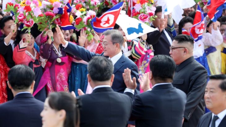 ![Moon was greeted by Kim at the airport [Pyongyang Press Corps/Getty Images]](https://www.aljazeera.com/wp-content/uploads/2018/09/b2245c94defd450f9ebf97ceec23f401_18.jpeg?quality=80)
