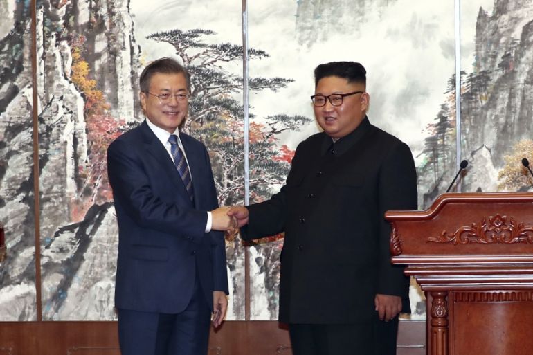 South Korean President Moon Jae-in, left, with North Korea's Kim Jong Un at the Pyongyang meeting [Pyongyang Press Corps Pool/AP]