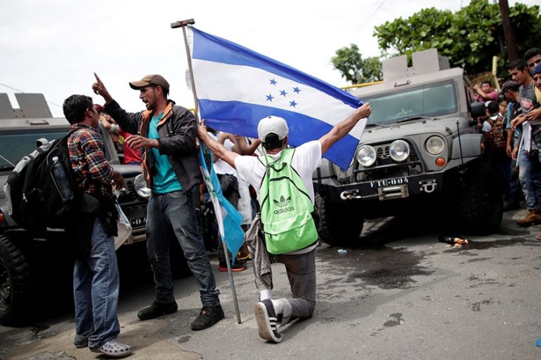 ![Honduran migrants react after crossing the border between Honduras and Guatemala, in Agua Caliente, Guatemala [Jorge Cabrera/Reuters]](https://www.aljazeera.com/wp-content/uploads/2018/10/07af9cfbfd454c848d2debe955c8b1cd_18.jpeg?quality=80)