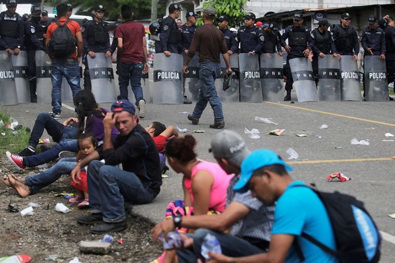 ![Honduras immigrants stand in front of Honduran police officers blocking the access to the Agua Caliente border with Guatemala as they try to join a migrant caravan heading to the US [Jorge Cabrera/Reuters]](https://www.aljazeera.com/wp-content/uploads/2018/10/2f5eb9f062784a888112602bd2355e16_18.jpeg?quality=80)