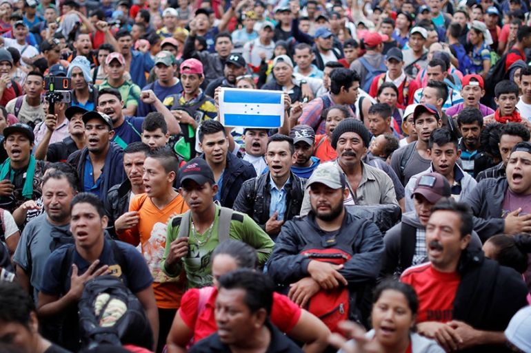 ![A Honduran migrant protects his child after fellow migrants and refugees, part of a caravan trying to reach the US, stormed a border checkpoint in Guatemala, in Ciudad Hidalgo, Mexico [Ueslei Marcelino/Reuters]](https://www.aljazeera.com/wp-content/uploads/2018/10/4e1d9fc4711f486db6e9ca4a91f68dc8_18.jpeg?quality=80)