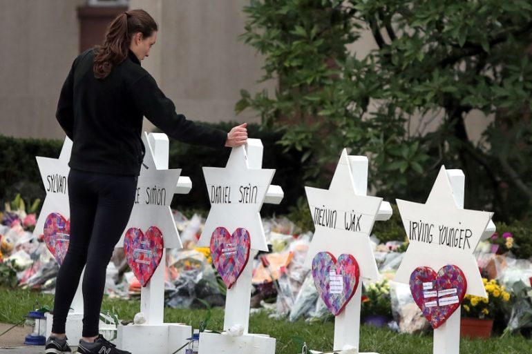 ![People mourn the loss of life as they hold a vigil for the victims of Pittsburgh synagogue shooting in Pittsburgh, Pennsylvania, U.S [John Altdofer/Reuters]](https://www.aljazeera.com/wp-content/uploads/2018/10/f03cb5412dec48b8b896ddd932b5a1a5_18.jpeg?quality=80)