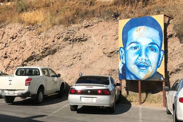 A portrait of 16-year-old Mexican youth Jose Antonio Elena Rodriguez, who was killed in Nogales, Mexico, is displayed on the Nogales street where he was killed that runs parallel with the US border [File: Anita Snow/AP Photo]