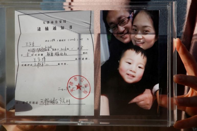 A picture showing Wang Quanzhang's family and his detention notice [Thomas Peter/Reuters]