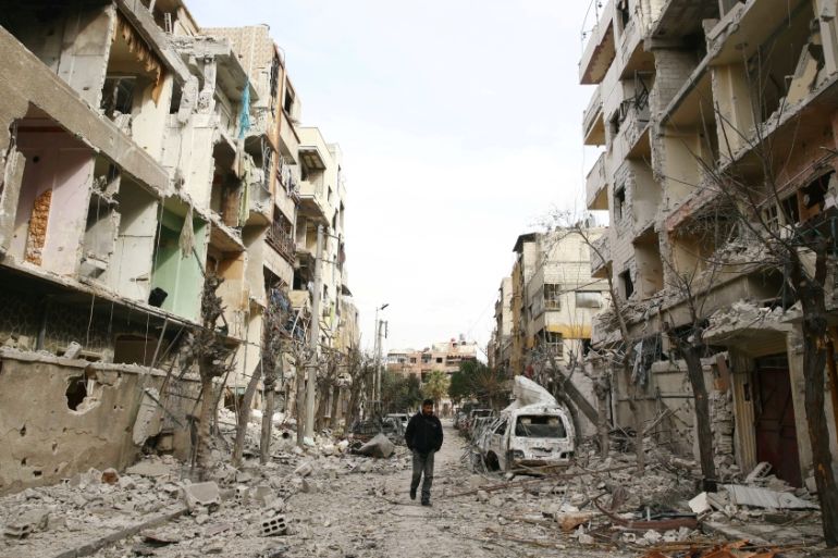 A man walks on a damaged street in the besieged town of Douma, Eastern Ghouta, Damascus
