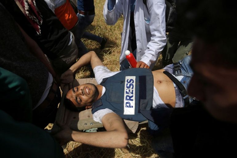 The Palestinian Journalists Syndicate said seven other reporters were injured in Friday’s protest, in what they described as “deliberate crimes committed by the Israeli army”.